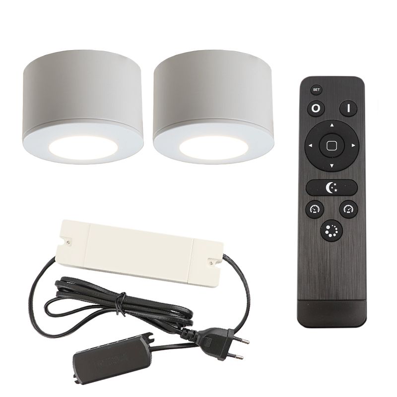 2 ronde witte veranda opbouwspots Vasso, IP44, incl. aansluitset en afstandbediening