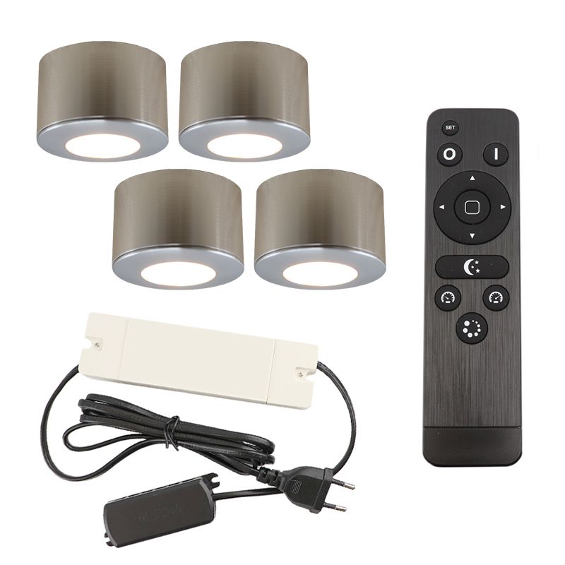 4 ronde geborsteld Chroom veranda opbouwspots Vasso, IP44, incl. aansluitset en afstandbediening