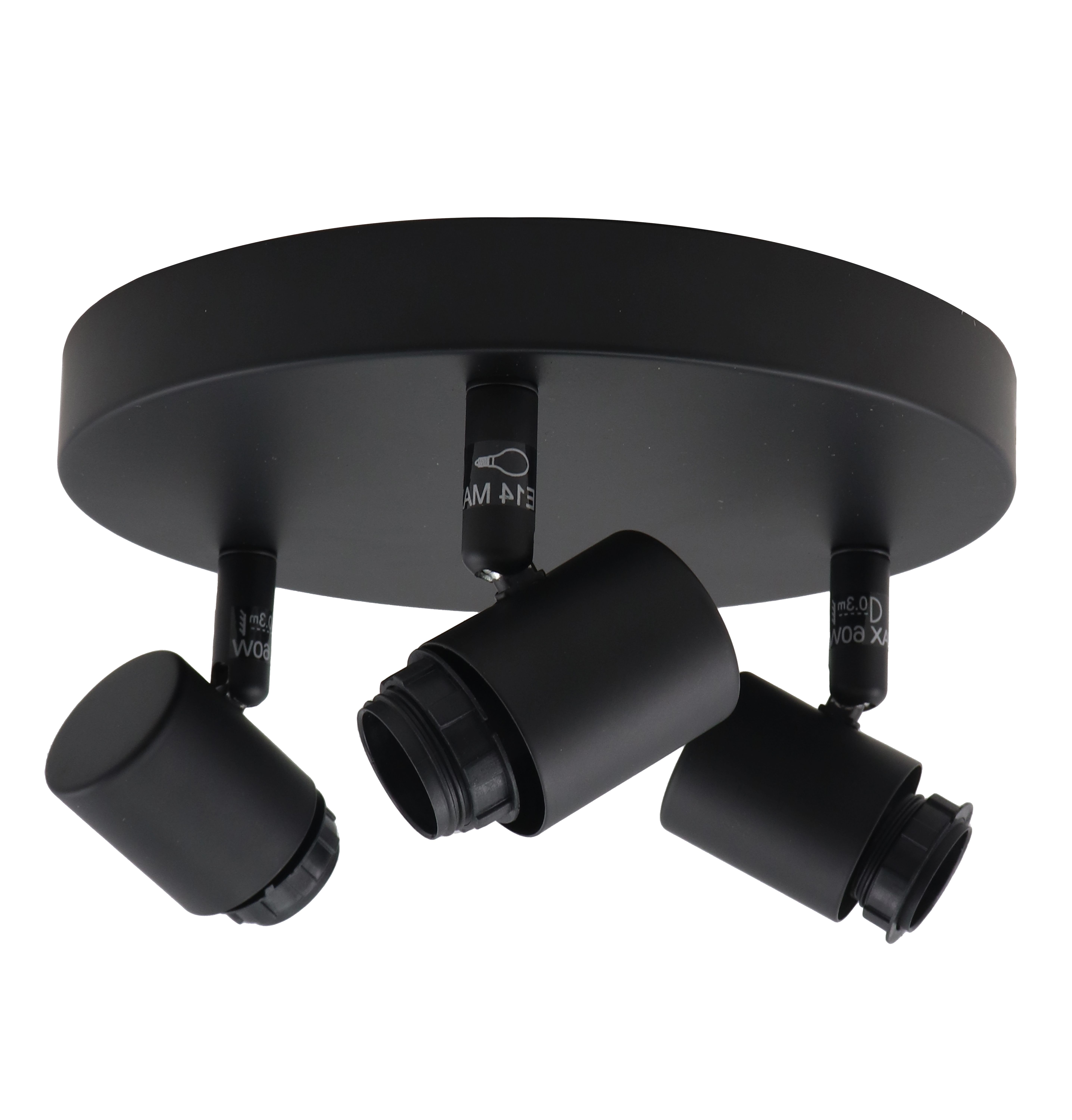 De zwarte plafondfitting Rika is gemaakt van aluminium. De zwarte plafondfitting wordt geleverd exclusief bijpassende lichtbronnen. In deze lamp moeten 3 lichtbronnen met E14 fittingen. Het maximale wattage van de lichtbronnen mag niet hoger dan 25 watt per lamp zijn.