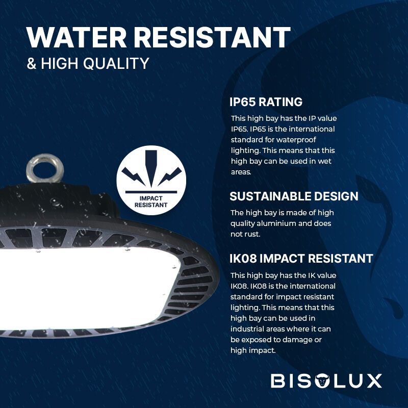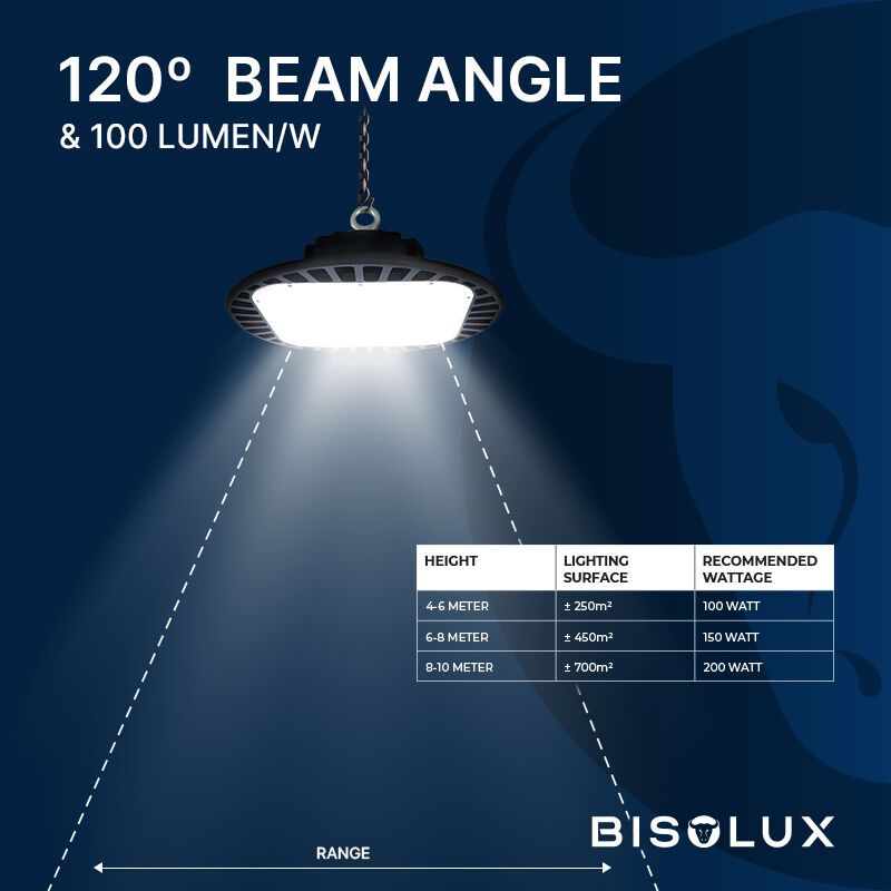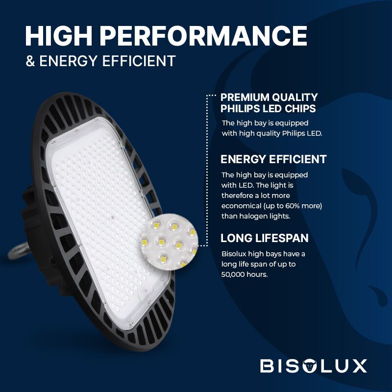 De Bisolux LED High Bay met Philips trafo is de ideale verlichting voor grote ruimtes. De High Bay produceert enorm veel licht en is daardoor met name geschikt voor ruimtes hoger dan 5 meter. De stevige LED lamp geeft krachtig en helder licht en zorgt voor een grote lichtopbrengst. De lichtbron verspreidt een grote hoeveelheid licht en met een lichthoek van 120 graden komt het licht in alle hoeken van de ruimte. Met een LED High Bay verlicht je efficiënt hoge ruimtes zoals magazijnen, werkplaatsen, (fabrieks)hallen, opslagruimtes, schuren en open stallen. Een High Bay hangt voornamelijk in ruimtes met een hoogte tussen de 5 en 12 meter. Maar ook een ruimte van 20 meter hoog verlicht de High Bay lamp met gemak.
