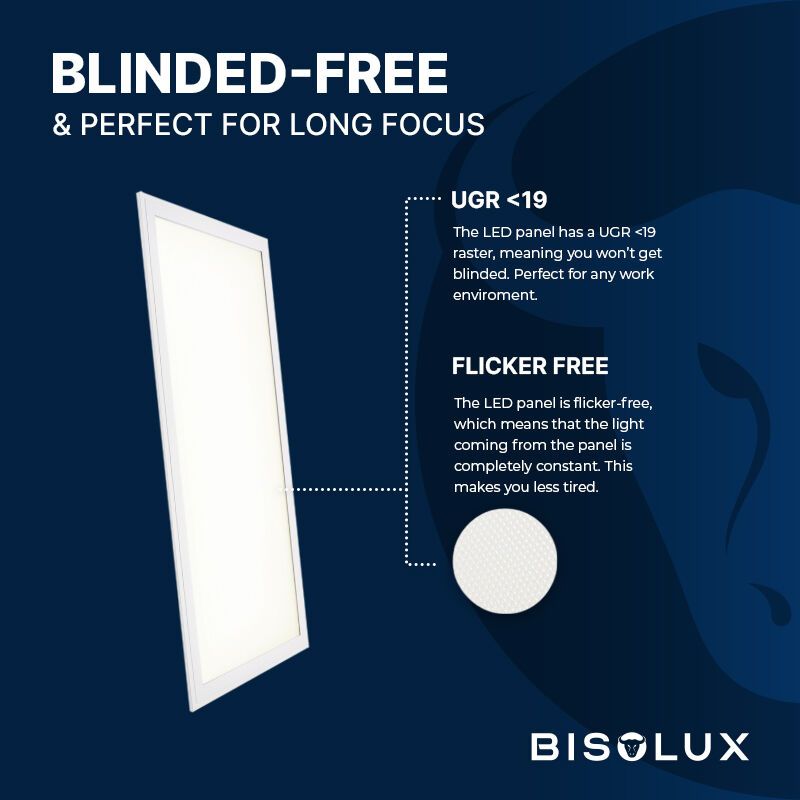 De UGR waarde van een LED paneel geeft de mate van verblinding aan. Hoe hoger dit getal hoe hoger de verblinding. Het is de Europese aanbeveling om op kantoren en scholen te kiezen voor UGR <19. Dit LED paneel heeft de UGR waarde <19. Jouw medewerker of bezoeker zal dan ook geen lichthinder of verblinding ervaren wanneer je dit LED paneel toepast in jouw kantoor, vergaderruimte, balie, kantine of klaslokaal.