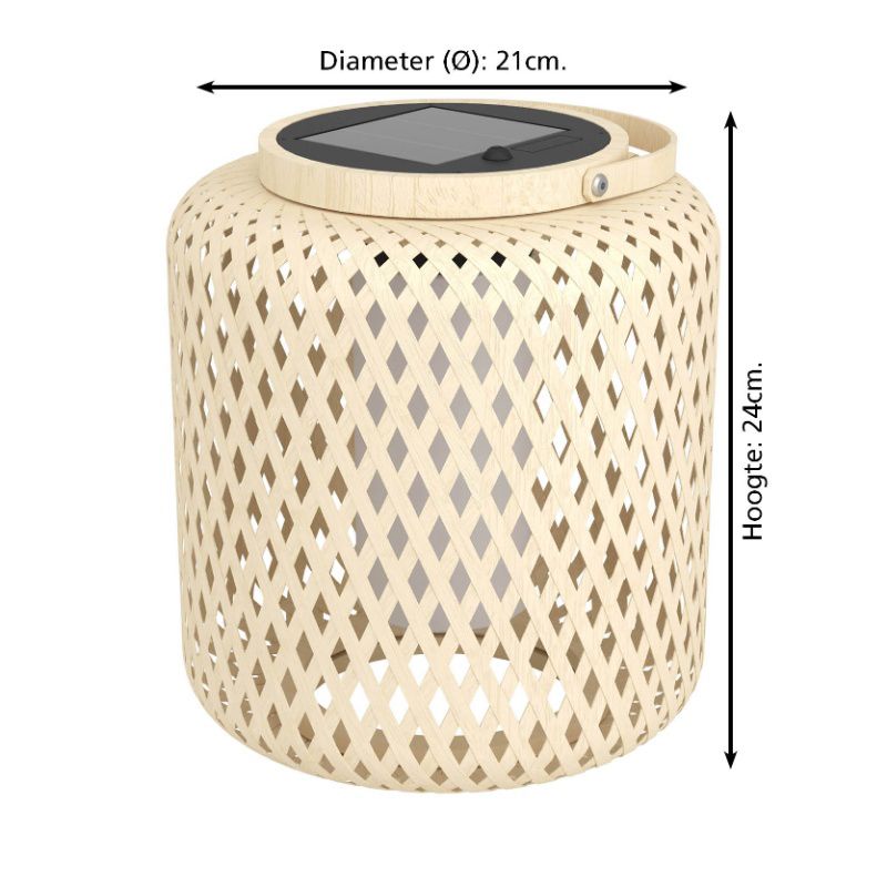 Product informatie Maximale wattage 3.3 Aansluitspanning Zonne energie Aantal lampjes 1 Aantal lumen 300 Product informatie Lichtkleur 4000K (wit) Type fitting LED ingebouwd Type lichtbron bijgevoegd Geïntegreerd LED Verwachte aantal branduren 15000 Incl. lampje Ja, geïntegreerd Breedte in cm 21 Diameter in cm 21 Hoogte in cm 24 Lengte in cm 21 Dimbaar Nee Garantie 2 jaar IP waarde IP44 (stof- en waterbestendig) Kleur Bruin, Wit Materiaal Kunststof, Hout, Staal Met schakelaar Ja Stijl Basis Type schakelaar Aan/uit schakelaar op het product Artikelnummer Q21357 - Home