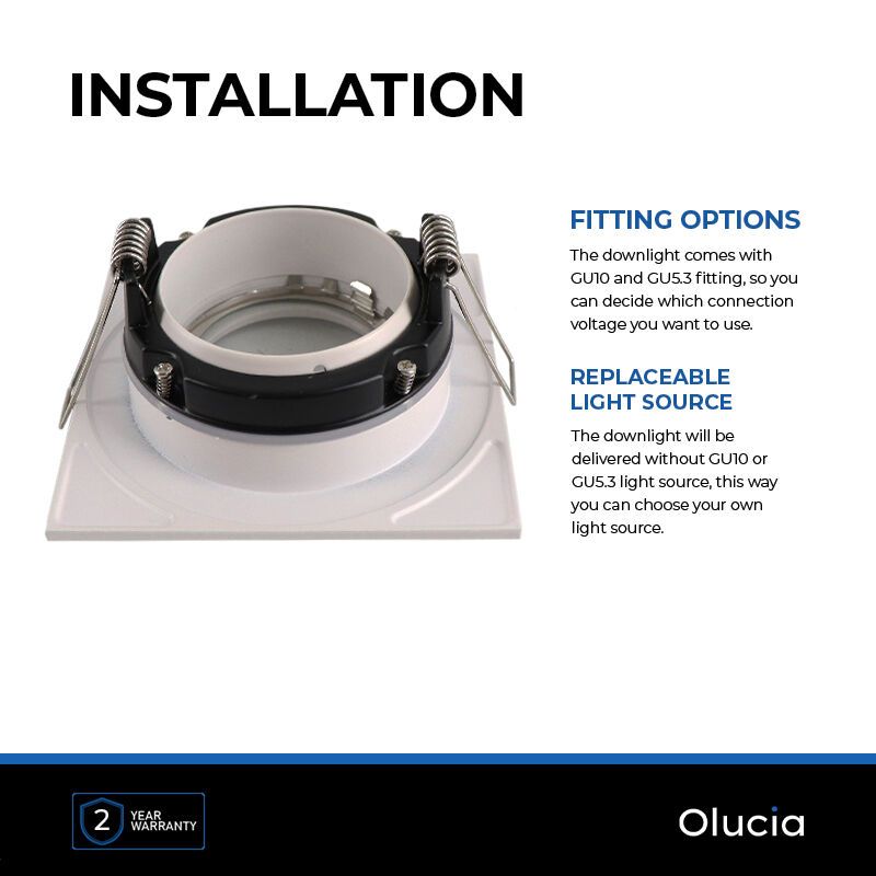 De kantelbare inbouwspot wordt geleverd met een GU10 voetje en met een GU5.3 (MR16) voetje. Deze kan je aansluiten op een 230 Volt GU10 lampje of een 12 Volt GU5.3 (MR16) lampje. De voetjes hebben 2 draden als uitgangspunt, deze kan je aansluiten op jouw aansluitdraden. Met eenvoudige lasklemmen of kroonsteentjes kan je meerdere spotjes met elkaar verbinden en/of op een schakelaar of dimmer aansluiten.