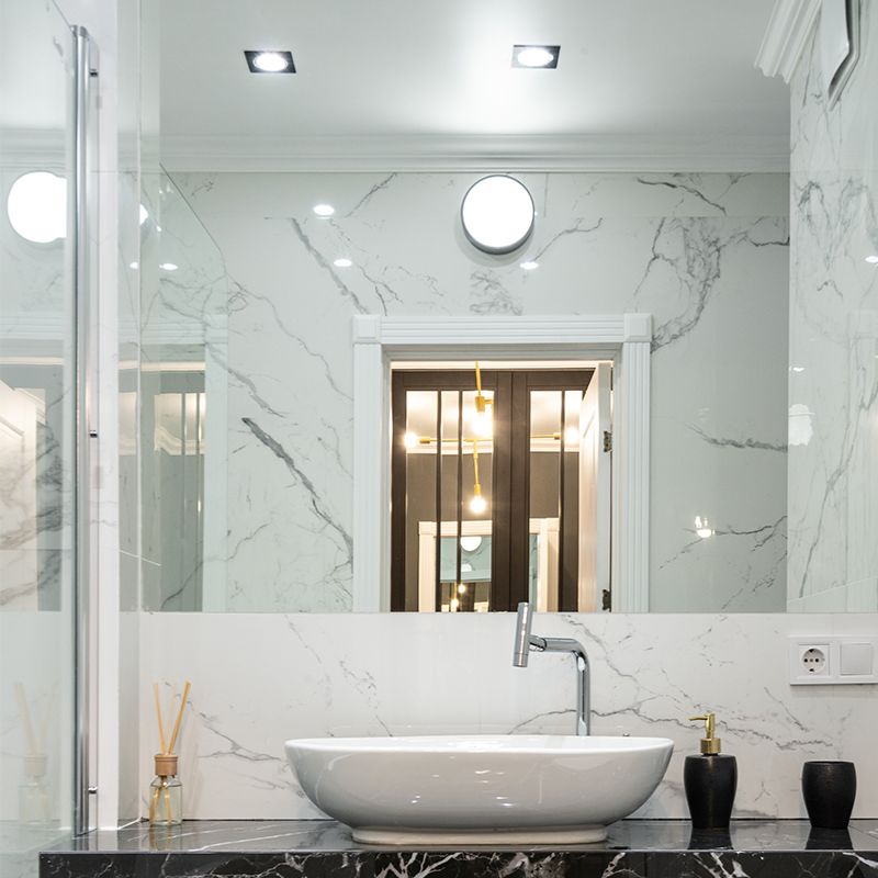 In de badkamer kan je zowel een 12 Volt als een 230 Volt lichtbron toepassen. Het voordeel van 230 Volt is dat je hierbij geen transformator nodig hebt tussen de 230 Volt aansluitspanning en de 12 Volt inbouwspotjes.