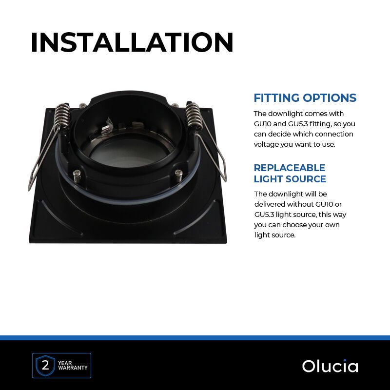 De kantelbare inbouwspot wordt geleverd met een GU10 voetje en met een GU5.3 (MR16) voetje. Deze kan je aansluiten op een 230 Volt GU10 lampje of een 12 Volt GU5.3 (MR16) lampje. De voetjes hebben 2 draden als uitgangspunt, deze kan je aansluiten op jouw aansluitdraden. Met eenvoudige lasklemmen of kroonsteentjes kan je meerdere spotjes met elkaar verbinden en/of op een schakelaar of dimmer aansluiten.