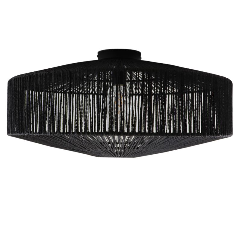 De landelijke plafondlamp Pippa is zwart van kleur en gemaakt van touw. De zwarte plafondlamp wordt geleverd exclusief bijpassende lichtbron. In deze lamp moet een lichtbron met E27 fitting en het maximale wattage van de lichtbron mag niet hoger zijn dan 7 watt.