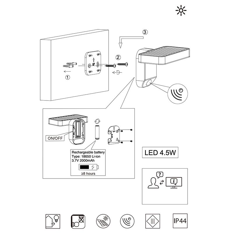 Product informatie Maximale wattage 4.5 Aansluitspanning Zonne energie Aantal lampjes 1 Aantal lumen 290 Product informatie Lichtkleur 3000K (warm wit) Type fitting LED ingebouwd Type lichtbron bijgevoegd Geïntegreerd LED Verwachte aantal branduren 20000 Incl. lampje Ja, geïntegreerd Breedte in cm 18 Gewicht in kg 0.42 Hoogte in cm 12 Dimbaar Nee Garantie 2 jaar IP waarde IP44 (stof- en waterbestendig) Kleur Antraciet Materiaal Kunststof Met schakelaar Ja Stijl Modern Type schakelaar Bewegingssensor Artikelnummer Q14617 - Home