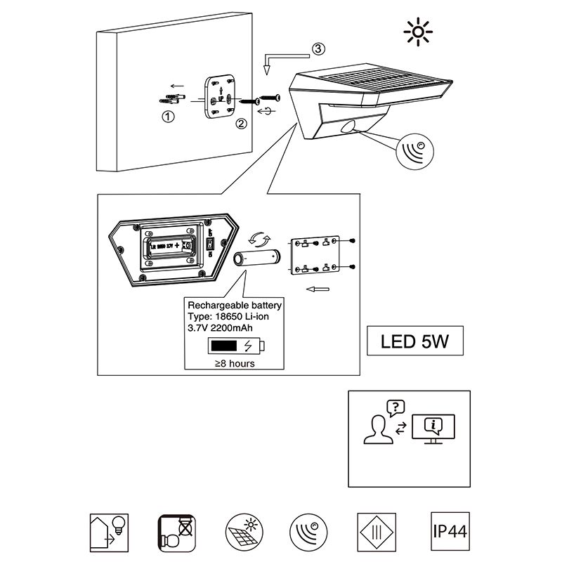 Product informatie Maximale wattage 5 Aansluitspanning Zonne energie Aantal lampjes 1 Aantal lumen 200 Product informatie Lichtkleur 3000K (warm wit) Type fitting LED ingebouwd Type lichtbron bijgevoegd Geïntegreerd LED Verwachte aantal branduren 20000 Incl. lampje Ja, geïntegreerd Breedte in cm 22 Gewicht in kg 0.46 Hoogte in cm 9 Lengte in cm 12.5 Dimbaar Nee Garantie 2 jaar IP waarde IP44 (stof- en waterbestendig) Kleur Antraciet Materiaal Kunststof Met schakelaar Ja Stijl Modern Type schakelaar Bewegingssensor Artikelnummer Q14620 - Home