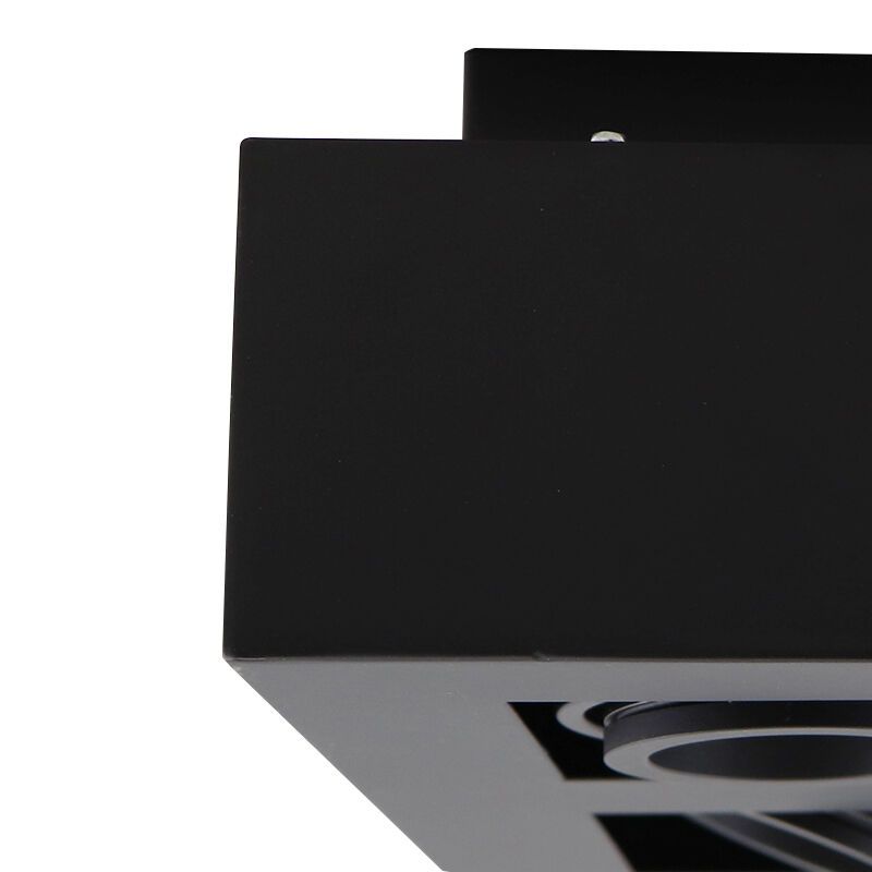 De moderne opbouwspot Akira is zwart van kleur en gemaakt van aluminium. De zwarte opbouwspot wordt geleverd exclusief bijpassende lichtbronnen. In deze lamp moeten 4 lichtbronnen met GU10 fittingen. Het maximale wattage van de lichtbronnen mag niet hoger zijn dan 25 watt.