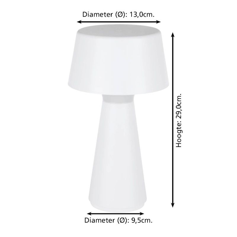 Product informatie Maximale wattage 3 Aansluitspanning Op batterij Aantal lampjes 1 Aantal lumen 240 Product informatie Lichtkleur White switch Type fitting LED ingebouwd Type lichtbron bijgevoegd Geïntegreerd LED Incl. lampje Ja Diameter in cm 13 Hoogte in cm 29 Kabellengte 50 Dimbaar Ja (meegeleverd) Garantie 2 jaar IP waarde IP44 (stof- en waterbestendig) Kleur Wit Materiaal Kunststof Met schakelaar Ja Stijl Basis Type schakelaar Aan/uit touch schakelaar op het product Artikelnummer Q27898 - Home