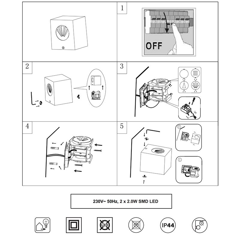 Product informatie Maximale wattage 2 Aansluitspanning 220-240V Aantal lampjes 2 Aantal lumen 200 Product informatie Lichtkleur 3000K (warm wit) Type fitting LED ingebouwd Type lichtbron bijgevoegd Geïntegreerd LED Verwachte aantal branduren 30000 Incl. lampje Ja, geïntegreerd Breedte in cm 10 Gewicht in kg 0.34 Hoogte in cm 9 Lengte in cm 10 Dimbaar Nee Garantie 2 jaar IP waarde IP44 (stof- en waterbestendig) Kleur Wit Materiaal Kunststof Met schakelaar Nee Met snoer en stekker Nee Stijl Design Artikelnummer Q14508 - Home