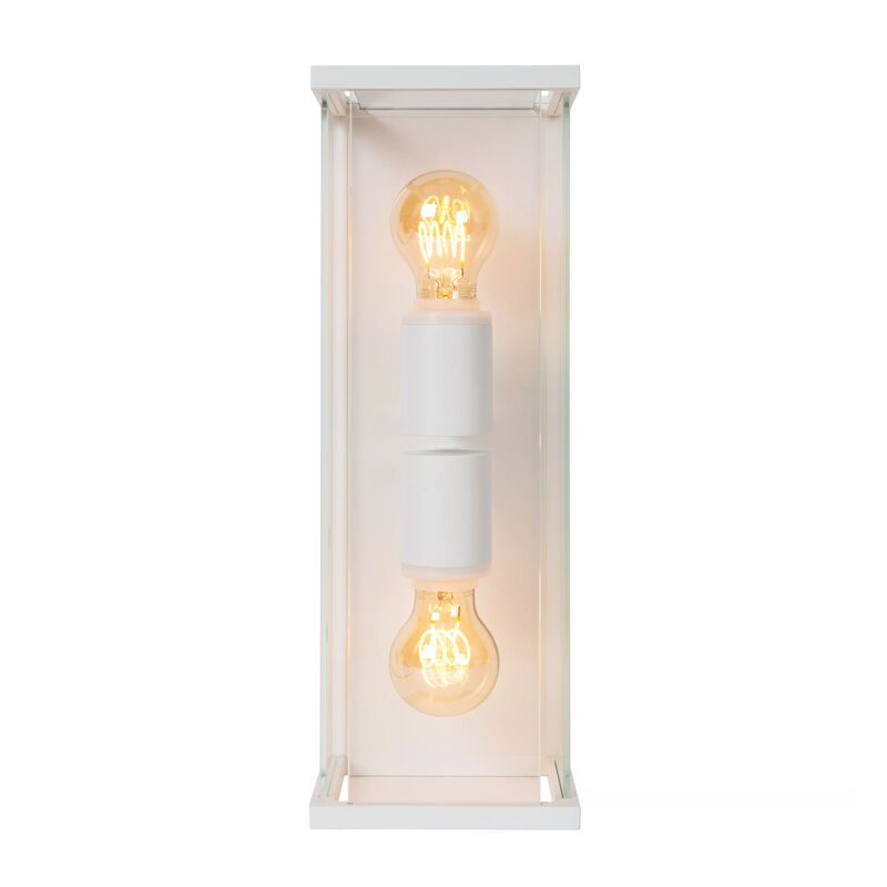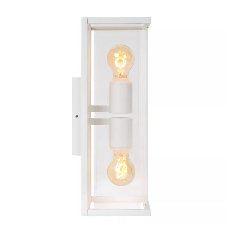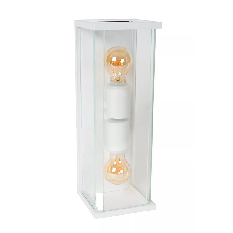 Product informatie Maximale wattage 60 Aansluitspanning 220-240V Aantal lampjes 2 Type fitting E27 Product informatie Incl. lampje Nee Breedte in cm 14 Gewicht in kg 2.7 Hoogte in cm 40 Lengte in cm 16 Dimbaar Ja (niet meegeleverd) Garantie 2 jaar IP waarde IP54 (stof- en waterbestendig) Kleur Transparant, Wit Materiaal Metaal, Glas Stijl Modern Artikelnummer Q51789 - Home