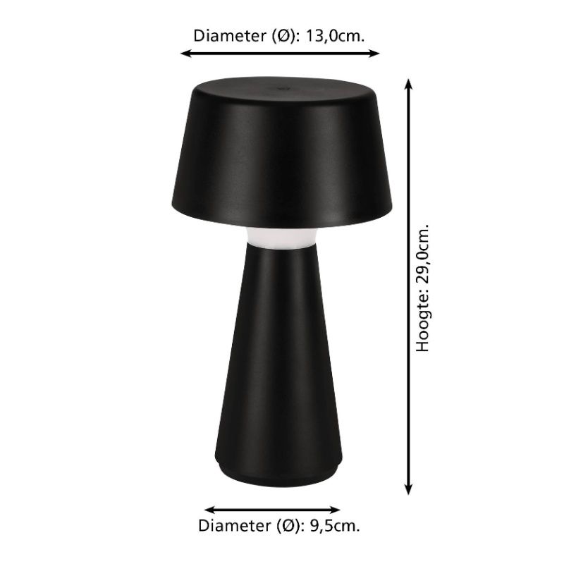 Product informatie Maximale wattage 3 Aansluitspanning Op batterij Aantal lampjes 1 Aantal lumen 240 Product informatie Lichtkleur White switch Type fitting LED ingebouwd Type lichtbron bijgevoegd Geïntegreerd LED Incl. lampje Ja Diameter in cm 13 Hoogte in cm 29 Kabellengte 50 Dimbaar Ja (meegeleverd) Garantie 2 jaar IP waarde IP44 (stof- en waterbestendig) Kleur Zwart Materiaal Kunststof Met schakelaar Ja Stijl Basis Type schakelaar Aan/uit touch schakelaar op het product Artikelnummer Q27897 - Home