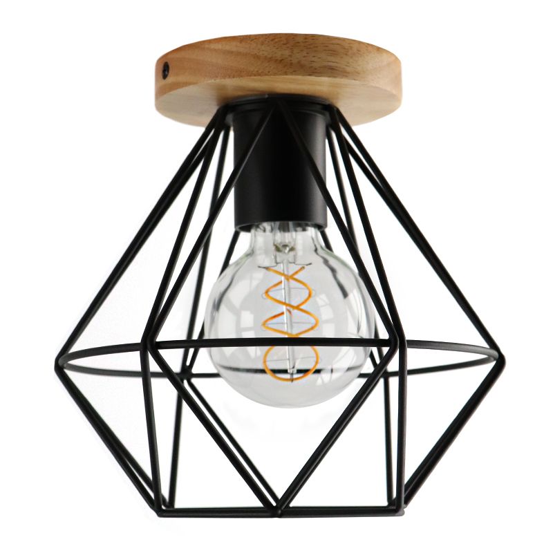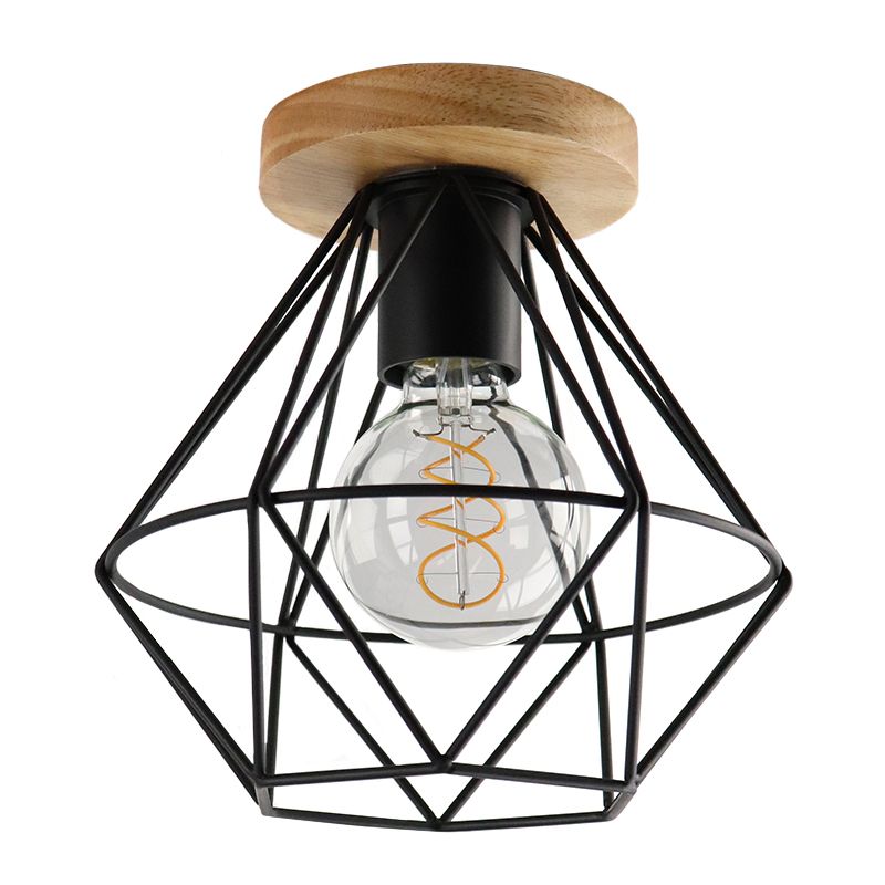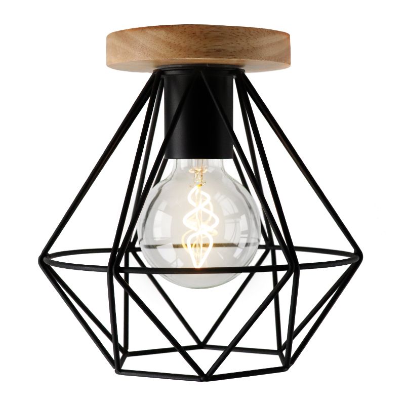 - Zwarte industriële plafonnière Jochem, met houten plafondkap